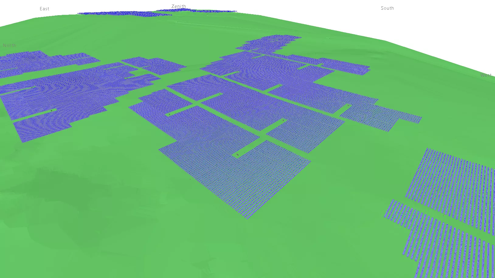 Modelamos os trackers no PVsyst com base no levantamento dos topos das estacas realizado em campo durante a construção da UFV, considerando a inclinação e a altura reais de cada tracker. Esse trabalho resultou em estimativas precisas das perdas por sombreamento.