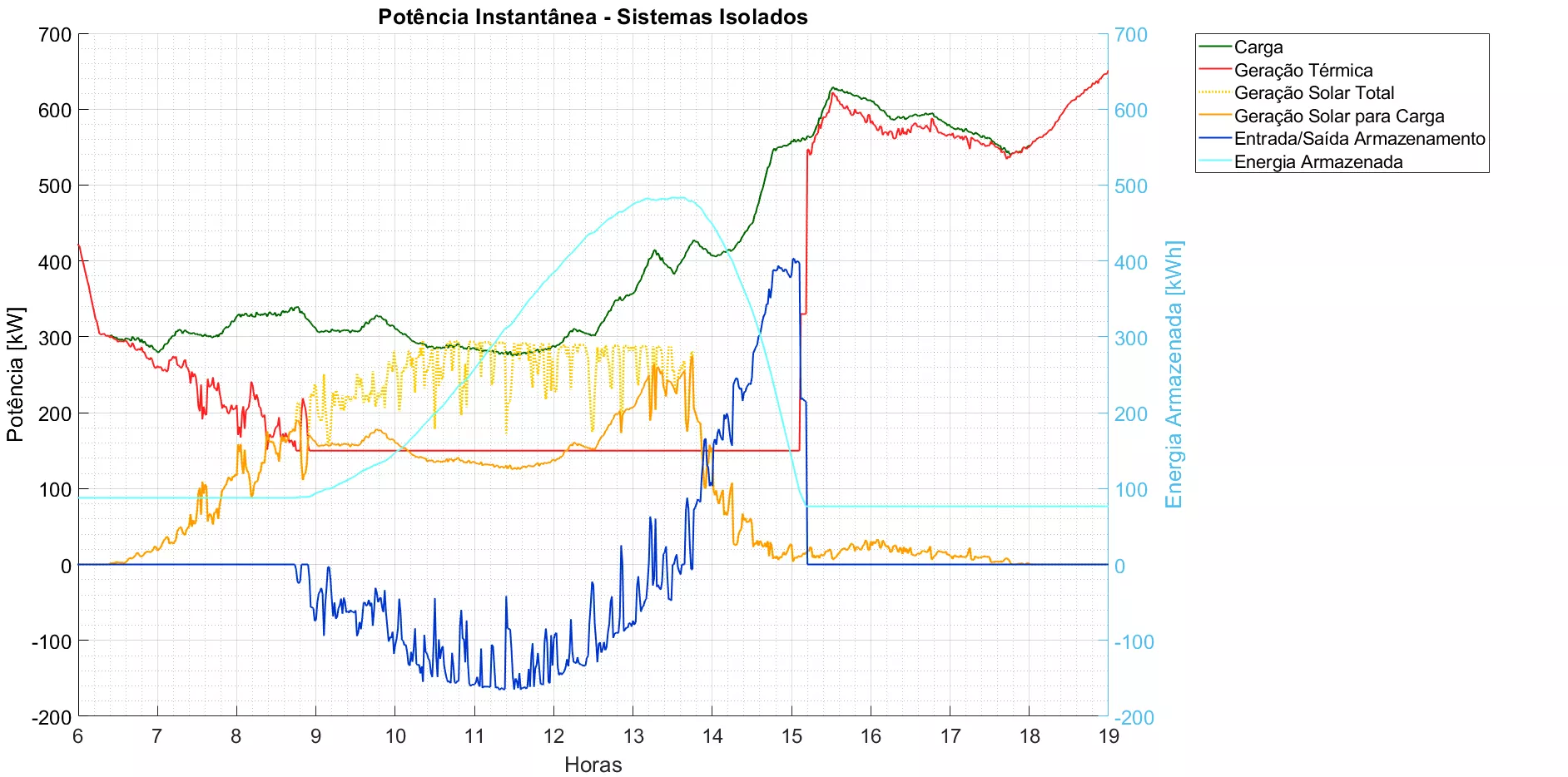 A análise associativa entre as fontes solar, térmica e o sistema de armazenamento foi realizada com alta resolução temporal, garantindo o atendimento total da carga independentemente das condições de recurso solar.